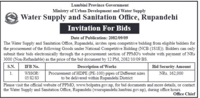 बोलपत्र आह्ववानको सूचना (First date of publication: Poush 09, 2082 (December 24, 2025)